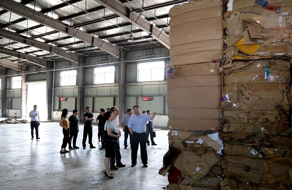 集團(tuán)領(lǐng)導(dǎo)首先參觀了六合基地內(nèi)的兩個(gè)廠房,詢問(wèn)了目前六合基地每天的廢紙收購(gòu)量及市場(chǎng)行情,并對(duì)廠區(qū)的生產(chǎn)消防安全工作提出要求。隨后,集團(tuán)領(lǐng)導(dǎo)一行與紙聯(lián)公司負(fù)責(zé)人就紙聯(lián)公司“不忘初心、牢記使命”主題教育活動(dòng)開(kāi)展情況進(jìn)行深入研討。紙聯(lián)公司黨總支書記、董事長(zhǎng)陸明燦匯報(bào)了公司上半年黨建紀(jì)檢工作情況、經(jīng)營(yíng)指標(biāo)完成情況、六合基地運(yùn)營(yíng)情況以及目前遇到的困難,并對(duì)目前廢紙行業(yè)情況進(jìn)行了分析。